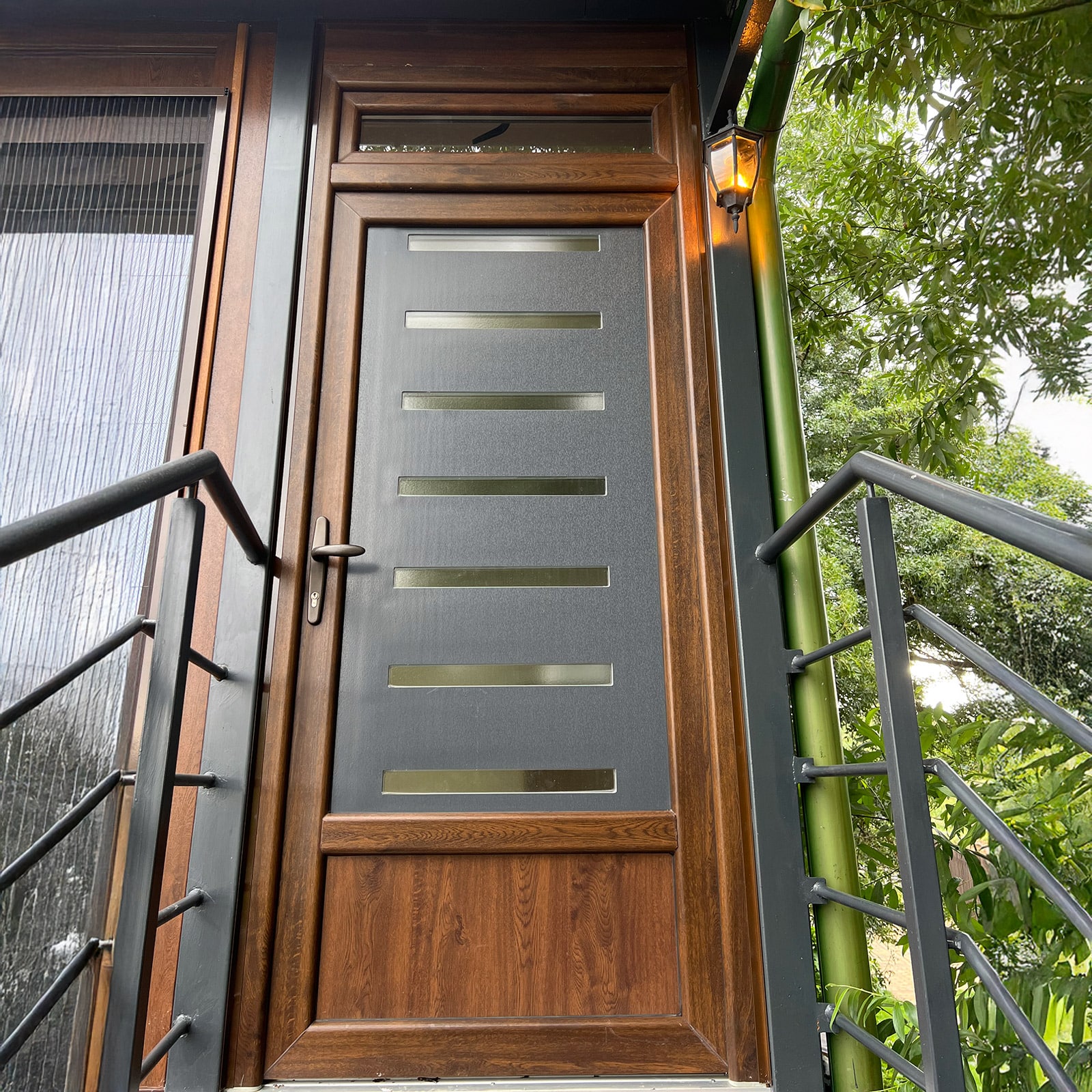 Dvokrilna PVC ulazna vrata Inoutic Deceuninck u antracit boji sa dekorom drveta namenjena su širim ulazima gde je potreban reprezentativniji izgled.