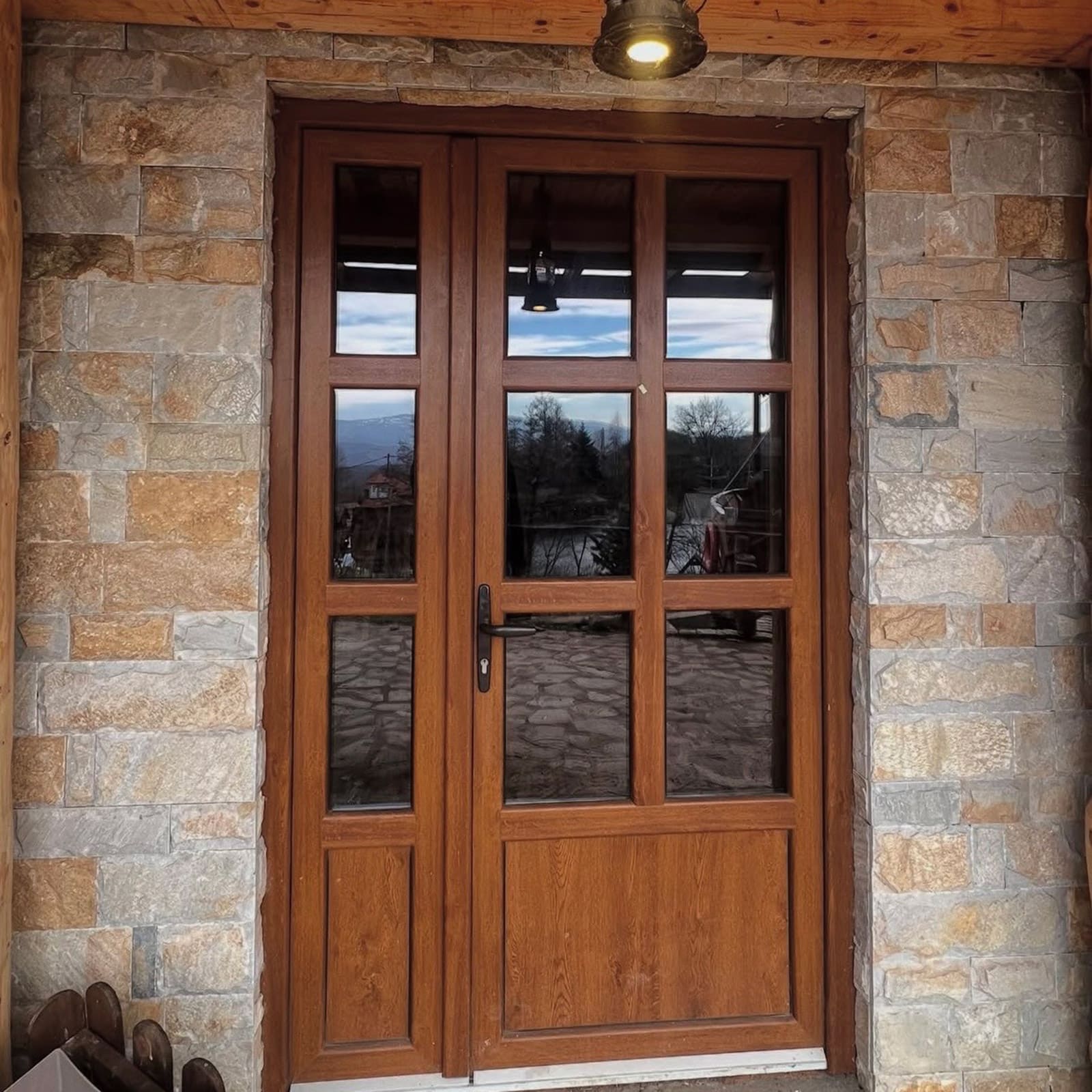 Ova konfiguracija kombinuje praktičnost dvokrilnih vrata sa dobrim izolacionim svojstvima PVC sistema.